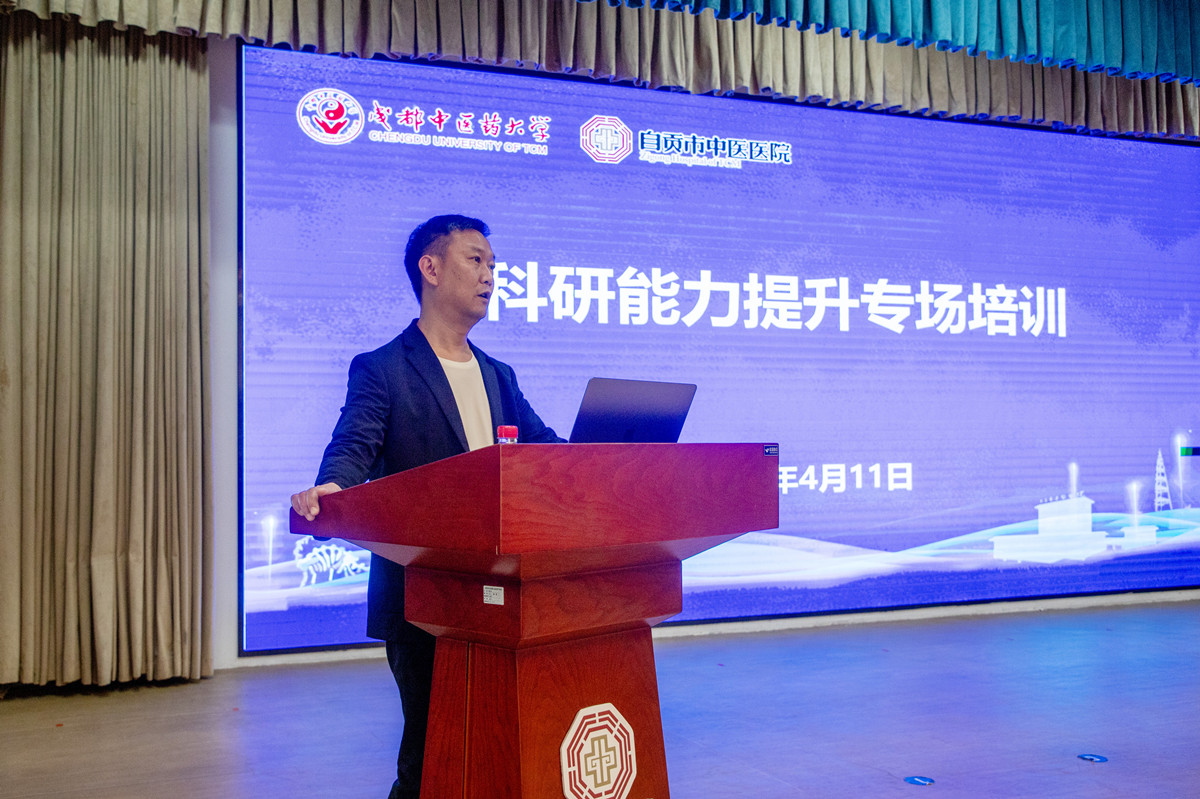 为进一步推进成都中医药大学附属自贡医院建设,全面提升医院科研教学水平。4月11日,成都中医药大学养生康复学院院长金荣疆教授及其研究团队专程来到附属医院·自贡市中医医院,院校联合举办第6期“杏林大讲堂”科研能力培训专场,聚焦科研素养培育与科研能力提升进行指导。培训由医院副院长雷从杰主持,150余名医务人员参加。