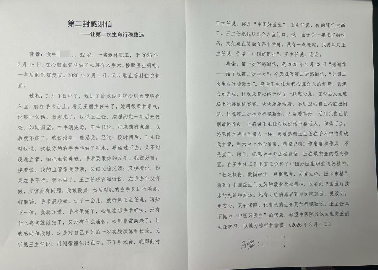 主任医师王丽表示,收到患者的第二封感谢信,既意外又暖心。“心脏介入手术的成功,不仅在于术中的精准操作,更在于术后长期的随访与药物康复指导。冠心病是全身性血管问题,术后定期复查,规范性用药,合理膳食配合中药调理,才能守护患者长期健康。”她介绍,陈先生的康复情况十分理想,严格遵循医嘱、积极配合康复,是他病情稳定的关键,而患者的认可与信任,更是医护人员前行的最大动力。