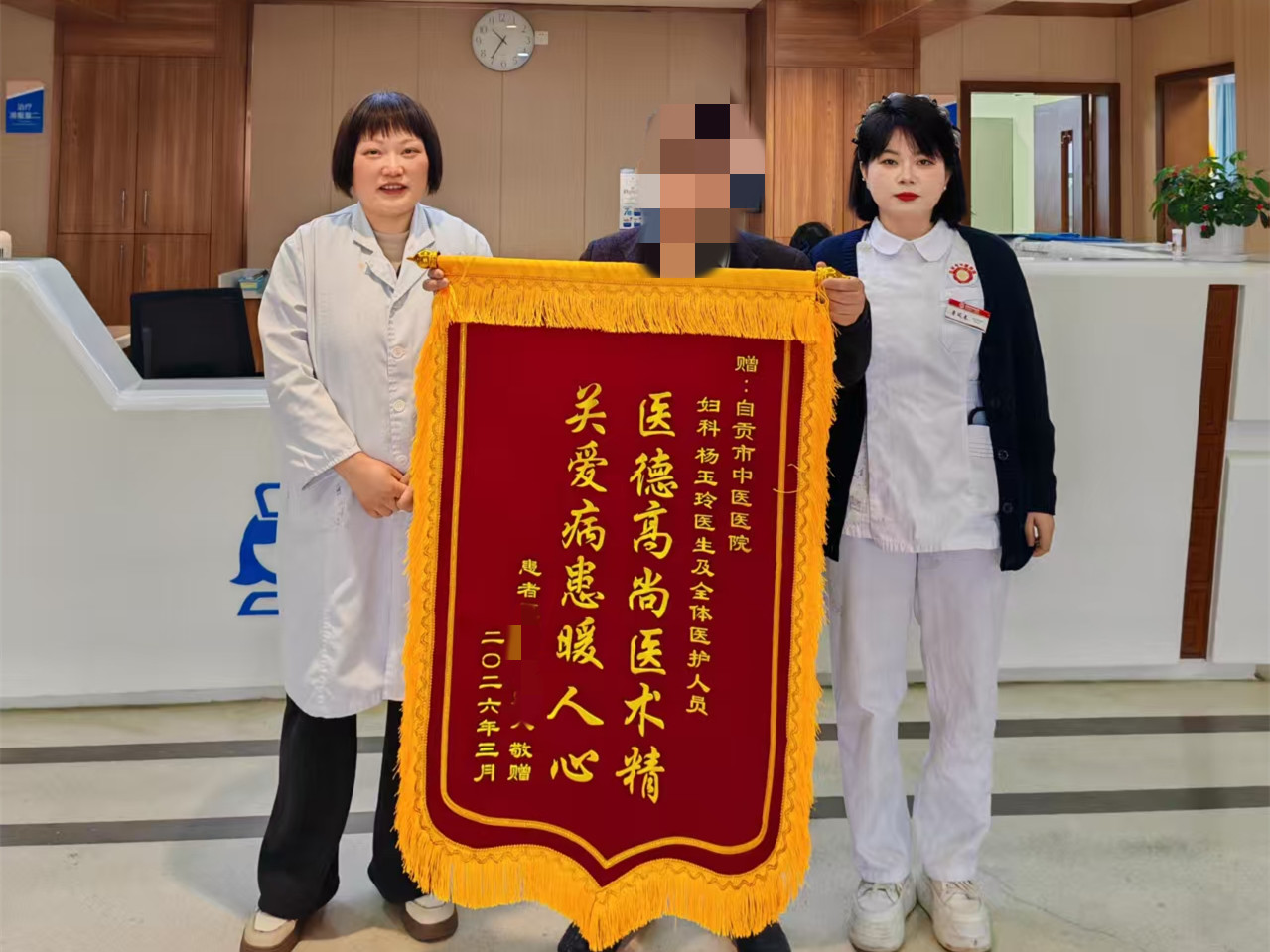 近日,家住内江市威远县的李女士及家属专程来到妇科病房,将一面写着“医德高尚医术精 关爱病患暖人心”的锦旗送到医护人员手中,向妇科全体医护人员表示感谢。