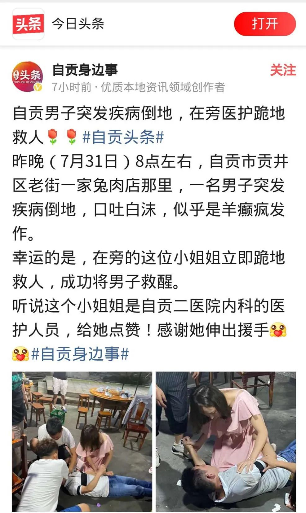 7月31日晚上8点左右,李璐希和朋友正在贡井老街的一家饭馆吃饭时,旁边一名男子忽然倒地,四肢抽搐、口角歪斜。李璐希见状,立即上前施救,及时采取措施,在朋友帮助下防止其发病过程中咬到舌头。