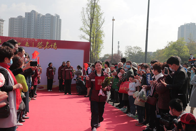 当我院援鄂队员曾晓冬、苏秋笛,手持鲜花和荣誉证书走过红毯时,所有人都欢呼雀跃起来,挥手鼓掌,欢迎英雄回家。党委书记陈彬、院长邓昭红带领院领导班子及部分职工用最大的敬意迎接英雄回家。