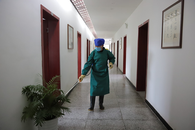 院区消毒是阻断病毒院内传播的关键环节。面对疫情,医院每日2次用循环风消毒机进行空气消毒1小时或用含氯制剂进行喷洒消毒,每晚对医院公共区域(就诊大厅、电梯、楼道、食堂、停车场等)进行空气消毒。每日2次对病区内的地面、护士站、病床、床旁桌等物体表面用含氯制剂进行擦拭消毒。