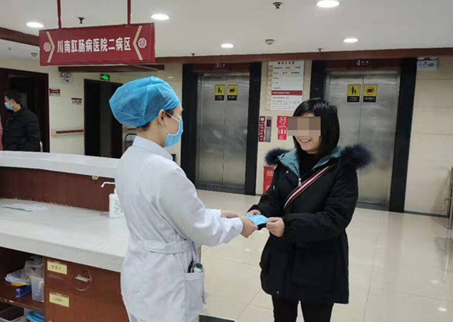 为更好的服务住院患者,医院各病区为住院患者在院期间提供口罩,劝导家属减少人员探视,指导探视者佩戴口罩探视病人。病区走廊内还设置速干手消毒剂,医护人员指导病人及家属正确实施手卫生。