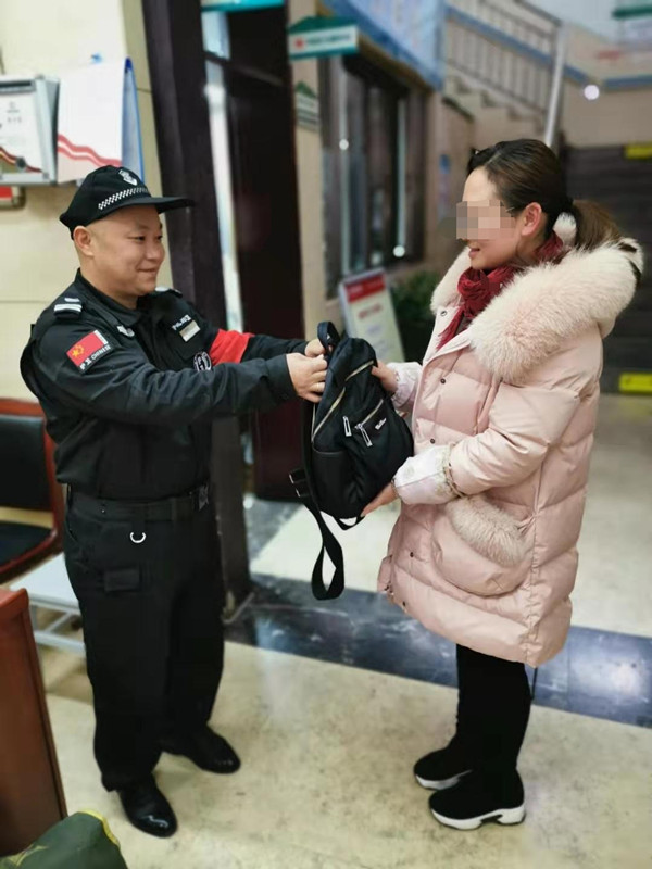 1月6日,檀木林分院保安陈远权巡视中捡到一个背包,他主动联系失主陈女士,将包交还。