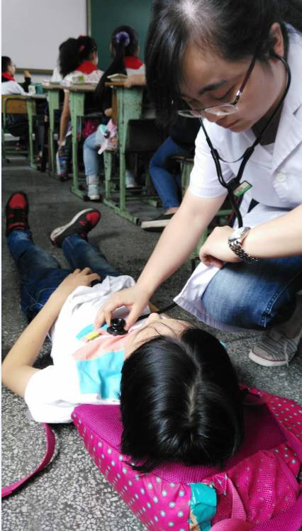 体检过程中还出现了一个小插曲:六年级的老师紧急向医务人员反映,该班学生在教室中突然晕倒,儿科袁彬医师立即飞奔到教室开展急救,并初步诊断为低血糖症,等到该生喝完糖水慢慢恢复意识后袁彬才返回体检现场重新开展工作。