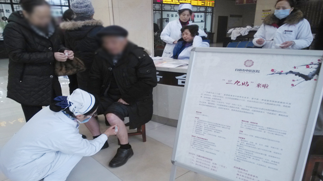 一大早,我院马冲口院本部门诊大厅内一站式服务台前便排起了长队,往年在我院贴敷着“三九贴”的老病人早早地就来了,后来的病人纷纷来到台前询问:“我有支气管炎能贴吗?”“我有胃肠炎能贴吗?”“我的孩子经常生病能贴吗?”……其中,正在一旁做着贴敷的老大爷说:“我在你们医院已经连续贴了三年“三九贴”了,效果很好,而且价格实惠,服务态度也很好”!为了满足更多患者“冬病冬治三九贴”的贴敷需要,我院在马冲口院本部的门诊大厅一楼、二楼和推拿科病房设了三个贴敷点,在檀木林分院针灸一科、汇东分院针灸二科分别设立了两个贴敷点。据统计, 22日,已有近300人到我院贴敷了“三九贴”。