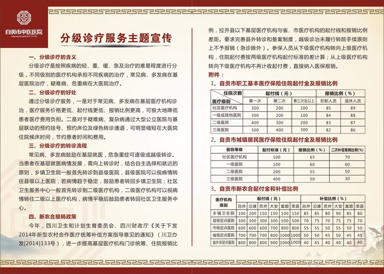 为进一步深化医药卫生体制改革,有效缓解群众“看病难,看病贵”问题,加快形成“小病在乡镇,大病进医院,康复回社区”的就医新格局。我院根据省卫计委等六部门印发的《关于建立完善分级诊疗制度的意见》(川卫办发〔2014〕257号)精神,按照自贡市卫生局和自贡市中医药管理局的要求,加大宣传力度,积极倡导全民分级诊疗。一是组织全员培训。结合医院实际,制定了实施方案,并通过中层干部会、政治学习会等,组织全院职工学习分级诊疗制度,做到人人了解政策,知晓政策。二是优化诊疗流程,在挂号室、诊断室、入院处、出院和新农合结算处等设置“基层转诊登记窗口”,方便转诊患者。三是加强多渠道宣传。通过标语、展板等形式积极宣传分级诊疗的重要内容,在导医台、医保办、出院结算处等窗口向患者发放印有分级诊疗含义、流程、好处等内容的宣传手册,做到让患者充分知晓。