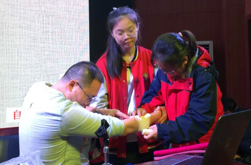 两位医生运用丰富的临床经验和扎实的理论知识,结合师生的实际情况,用通俗易懂的语言和标准的示范动作向到场师生分别讲授了心肺复苏和四肢外伤急救处理知识。
