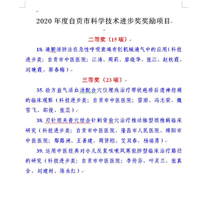 今年3月30日,由市科学技术局、市卫生健康委员会联合批复的“自贡市中西医结合研究院”正式成立,研究院自获建以来,在医院领导班子的高度重视下,在各相关部门的积极推动下,建设顺利,成效初现。目前已完成4项科研项目评价、1项科研项目申报省人民政府科学技术进步奖、4项科研项目申报市人民政府科学技术进步奖、申报省级科研项目9项、申报市级科研项目11项、申报卫生健康系统科研项目7项、获批成都中医药大学硕士研究生导师9人。
