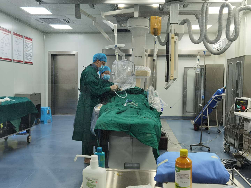这是一个前降支中段狭窄的病人,需要植入支架,在有效的沟通,取得病人及家属同意后,她熟练地将一颗支架通过导丝送到了血管狭窄处,球囊扩张,支架释放,血管狭窄解除,血流通畅,手术顺利地完成了。