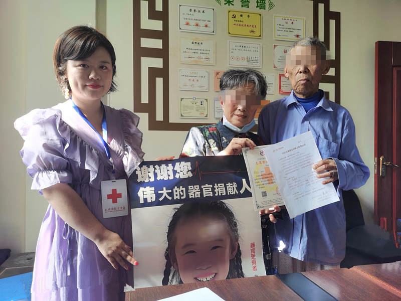 在和家人商量并征得同意后,他把自己的想法告诉了科室医护人员。14日下午,市红十字会工作人员,我院医务科科长舒小康和肿瘤血液科主任黄建清来到病房,在市红十字会工作人员详尽的政策宣讲后,袁大爷当场毅然在《中国人体器官捐献志愿登记表》上签字。同时,市红十字会工作人员向袁大爷颁发《中国人体器官捐献志愿登记证书》。