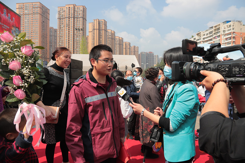 当我院援鄂队员曾晓冬、苏秋笛,手持鲜花和荣誉证书走过红毯时,所有人都欢呼雀跃起来,挥手鼓掌,欢迎英雄回家。党委书记陈彬、院长邓昭红带领院领导班子及部分职工用最大的敬意迎接英雄回家。