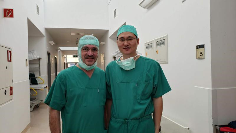 早在2019年4月,曾祥炳就通过了中德医学交流中心的考试。2019年12月,他前往德国格赖夫斯瓦尔德大学附属医院进修学习。该院位于德国东北部的一个海滨小城,其免疫、药理、内分泌和神经外科在全德国赫赫有名,曾祥炳所进修的神经外科更是在全世界久负盛名,脊柱外科的全年手术量约800 多台,主要涉及退变性疾病、脊柱肿瘤、脊柱矫形、脊柱感染和脊柱创伤等领域。