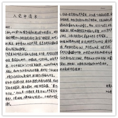 近日,我院第二批援鄂医疗小分队队员曾晓冬、苏秋笛先后写下入党申请书,希望早日成为一名光荣的共产党员,为人民健康事业贡献自己的力量。