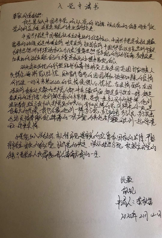 在疫情面前,在困难面前,我身边无数的共产党人都冲在了最前面,都是奋斗在一线,都是最美丽的“逆行者”,他们都是我的楷模,是我一生为之学习的榜样,他们激励着我坚定了加入中国共产党的决心。