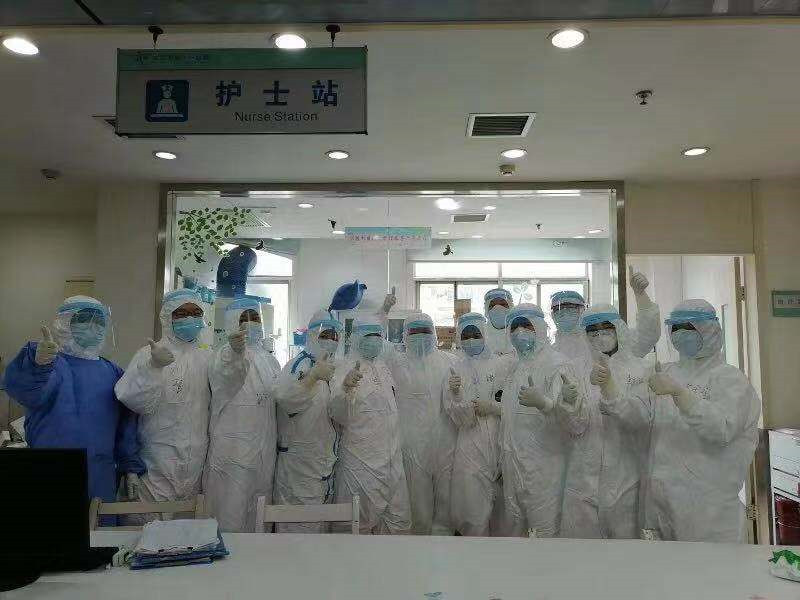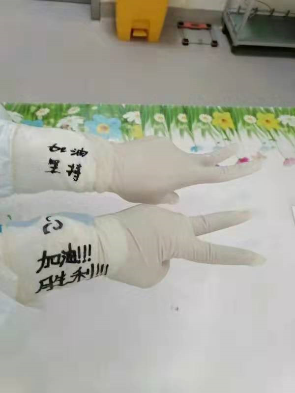 今天我们医院3个人排到了一个班口,穿好防护衣来到病房,护士长还表扬我们早早就去了,我们说“因为你们很辛苦,想让你们早些下班”。