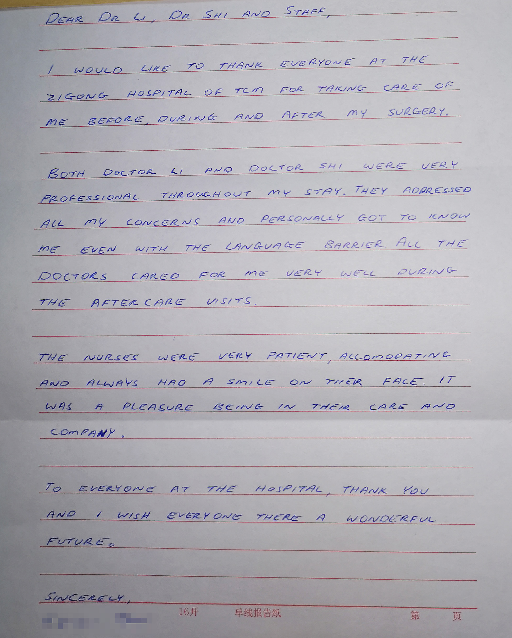 非常感谢自贡市中医医院的每一位工作人员在我围术期对我的照顾!