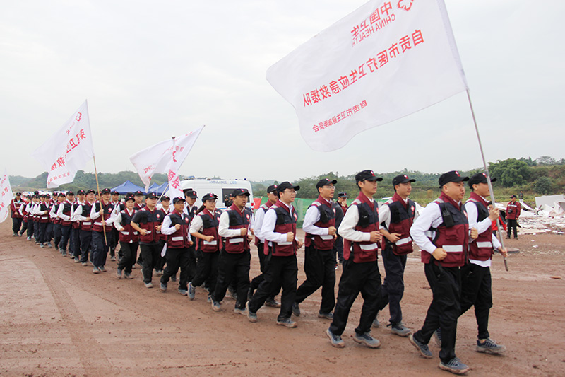 本次卫生应急联合演练在大安区和平街道东城大街和席草路交界处进行。演练模拟某地发生7.2级地震,50%以上房屋坍塌,震中停水停电,当地医疗机构处于瘫痪状态。“灾情”发生后,根据省卫健委的卫生应急救援队调令,5省(市)的15支国家、省、市、县级医疗卫生救援队伍以及4支社会各类志愿者救援队伍504人迅速集结。与此同时,自贡市第一时间启动应急预案,成立指挥部,75名应急救援人员和10台救援车辆抵达现场开展救援,5G急救车也首次亮相。