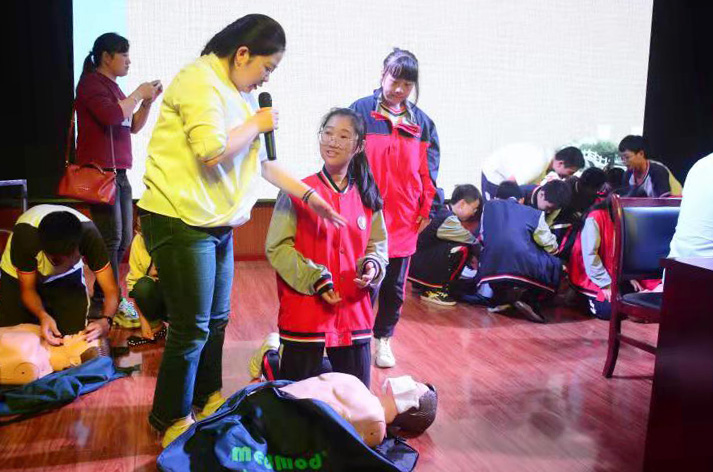 两位医生运用丰富的临床经验和扎实的理论知识,结合师生的实际情况,用通俗易懂的语言和标准的示范动作向到场师生分别讲授了心肺复苏和四肢外伤急救处理知识。