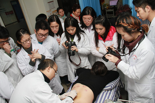 此后,参访留学生分为三组分赴医院马冲口本部、檀木林和汇东分院,实地参观中西医结合(肿瘤、血液)科、呼吸科、推拿科、肛肠科、针灸科、皮肤科、内二科等临床科室。在参访临床科室期间,医务人员细致地为留学生们现场演示、讲解针灸、推拿、中药熏洗、按摩以及中西医结合治疗等中医特色疗法,留学生们纷纷凑近观看,并拿出手机、相机和笔记本认真记录。一位来自葡萄牙的留学生用不太流利的中文竖着大拇指说道:“真棒!”。
