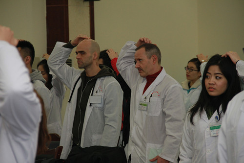 成都中医药大学国际教育学院副院长陈媛代表参访团留学生感谢医院精心周到的接待和安排,她希望借此机会提高留学生们对中国文化,对中医药的见解,加深院校之间的交流合作。随后,留学生们观看了医院宣传片,在医院老师的教授下学习感受了“项痹运动保健操”等医院自创中医保健操。留学生们看得入神、学得仔细,现场被轻松、愉快的气氛所包裹。