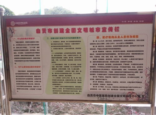 高度重视,明确责任。为积极配合我市全面、细致地做好创建工作,切实将各项工作任务落实到位,医院成立了创建全国文明城市工作领导小组,形成分工明确,管理到位,网络健全的领导体制和长效管理工作机制。同时,医院还印发了《自贡市中医医院创建全国文明城市工作的实施方案(2015—2017年)》,从指导思想、工作目标、强化组织、工作任务、保障措施五个方面全面、细致地对医院“创文”工作做出了具体安排。此外,为了提高创建工作质量,不断开创争创文明城市新局面,医院还制定印发了《自贡市中医医院创建全国文明城市示范医院创建活动实施方案》,依托落实“创文”工作全面开展示范医院创建工作,通过全面铺开、提档升级、创新突破,建立健全并落实长效机制,促进全院干部职工整体素质大提升,全院文明形象大提高。