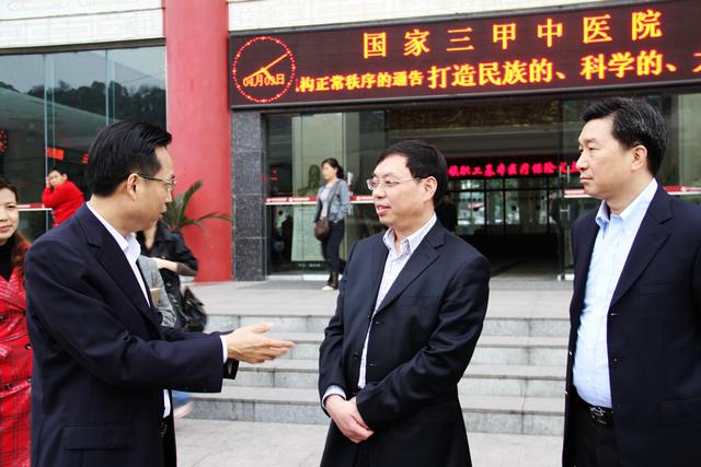 刘市长一行先后参观了医院门诊大厅和正在装修的住院大楼,并深入临床科室与医务人员交谈。刘市长在听取院长杨正春的情况汇报后,充分肯定了医院所取得的喜人成绩,同时也对医院今后的发展提出了殷切希望,一是希望医院建成“三甲”医院后,继续把突出中医特色作为立院之本,高位求进,在学科和重点专科建设上取得新的业绩,特别是要发挥中医药优势,在防治重大疾病方面做出贡献。二是希望医院加快推进项目建设,改善诊疗环境,特别指出要延伸服务领域,做好卧龙湖康疗中心项目规划,为市民提供高端养生、保健服务。三是希望医院以公立医院改革为动力,不断深化内部改革,增强与名校、名院的合作,积极引进医疗高层次人才。刘市长希望医院借助“三甲”东风,珍惜国家大力发展中医药事业的机遇,抓好项目建设,突出特色优势,实现医院跨越式发展。