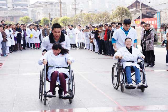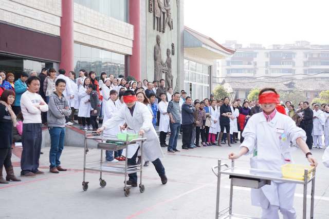 运动场上预先准备好的赛道、急诊箱和轮椅等道具,预示着比赛的紧张激烈与妙趣横生。运动会在比赛项目“医护同出诊”的哨声中拉开了帷幕,男队员背着急诊箱,女队员拿着血压计与听诊器,两队员相邻的腿还绑在一起,大家都努力地你追我赶,配合好的队员口里喊着一二一,配合不好的却在前行的赛道上困难重重。“瞎子敲锣”的比赛项目中,有些队员直接走到了别的参赛队的赛道,惹得现场观众忍俊不禁,捧腹大笑,硬是巴不得帮他们一把。在你来比划我来猜的项目中,参赛队员们语言、手势都用上还不够,有的把周围能形容的都用上,是既紧张又激烈,高潮迭起。赛场上欢呼声、笑声、掌声、加油声此起彼伏,一浪高过一浪,把赛场变成了欢乐的海洋。