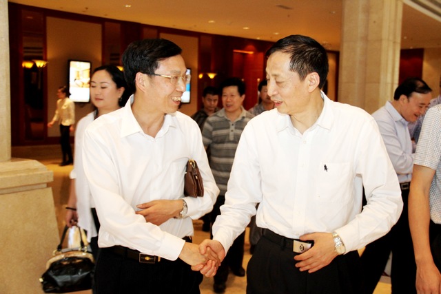 省政协副主席谢明道(右)与院长杨正春亲切握手