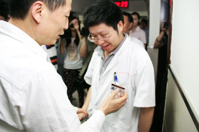 谢明道(左)亲切慰问医务人员