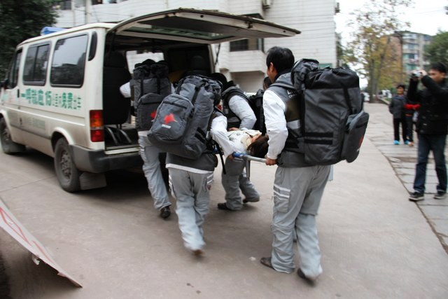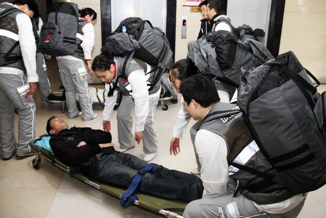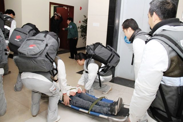 2011年12月9日下午2点40分,百余名医院工作人员和“病人”弓背从我院综合大楼有序跑出,并高声呼喊“着火了”,医院立即组织义务消防员和急救员迅速冲进大楼搜救被困人员,不到3分钟,便将2名昏迷患者送上了救护车……这惊心动魄的场面并不是一场重大火灾事故,而是我院精心组织的消防应急疏散救援演练。