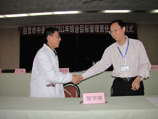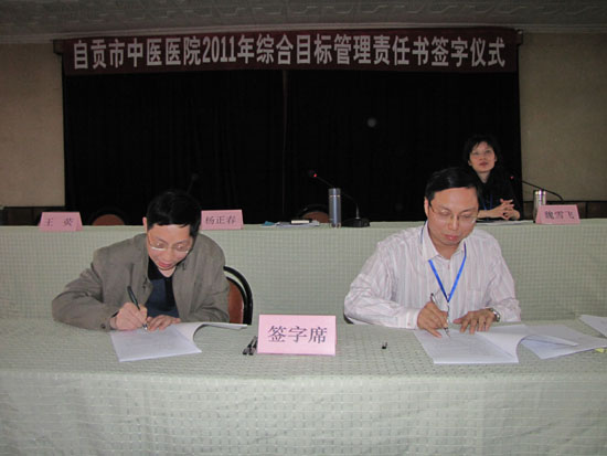 为认真落实医院年度工作计划,完成年度工作目标,根据院、科两级负责制的原则,4月14日下午,我院召开了中层干部大会,院长杨正春与各临床、医技科室主任签订了2011年综合目标管理责任书,下达了各科室2011年的主要目标与任务。