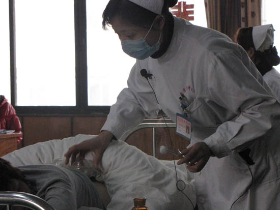 为使全院护理人员熟练掌握中医操作技能,丰富中医护理知识,我院近日在全院护理人员中开展了学习中医护理知识活动,活动分为中医操作示范讲解和中医理论知识学习两部分。示范操作中,示范人员现场以真人模拟形式对针刺法、灸法、拔罐法、穴位按摩法、耳穴压丸法、中药灌肠等中医护理常用操作进行示范讲解。护理部要求各科室对示范操作内容反复练习,人人熟练掌握,自行组织学习中医护理常规、技术操作规程、中医皮肤科护理常规、专科单病程护理常规等中医护理知识,提高中医护理质量。