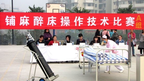 (图为:我院选手正在进行铺麻醉床操作)