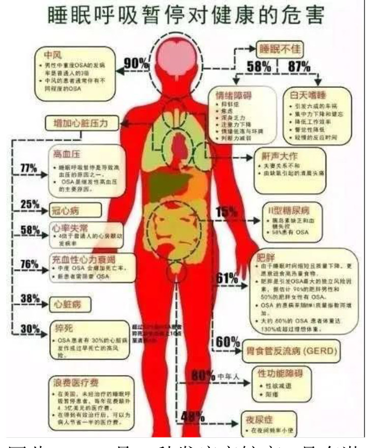 这是一种睡眠呼吸疾病,临床表现有夜间睡眠打鼾、呼吸暂停伴通气不足、夜尿增多、白天嗜睡、性格变化等。由于呼吸暂停引起反复发作的夜间血液中氧饱和度下降和高碳酸血症,该病可导致高血压、冠心病、糖尿病和脑血管疾病等并发症,甚至出现夜间猝死