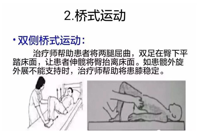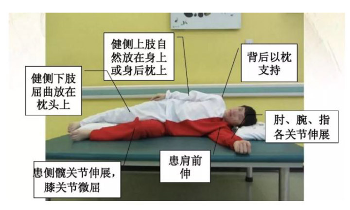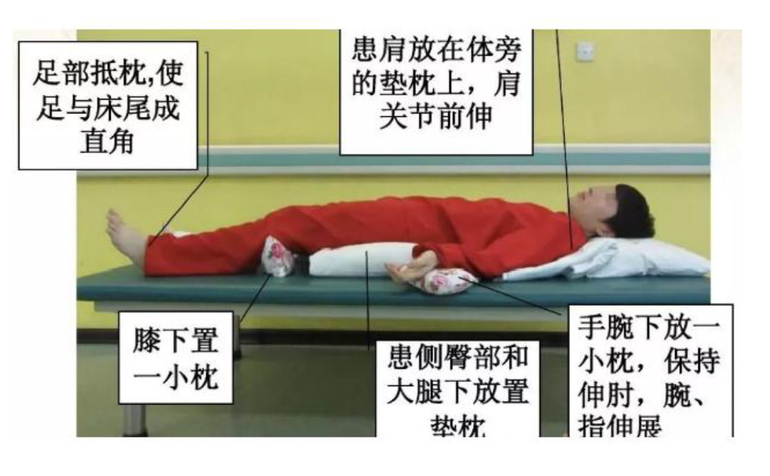 仰卧位:头下垫枕,避免侧屈、过屈或过伸。患侧肩后部垫枕,避免肩后缩。患侧上肢置于体侧方,适当外展,肘关节保持伸展,前臂旋后,拇指指向外方。患侧臀下垫枕,避免臀部后缩。患侧下肢股外侧用枕头支撑避免大腿外旋。患侧小腿或膝下避免垫枕,防止压迫下肢静脉与膝过屈或过伸。仰卧时间不宜过长。