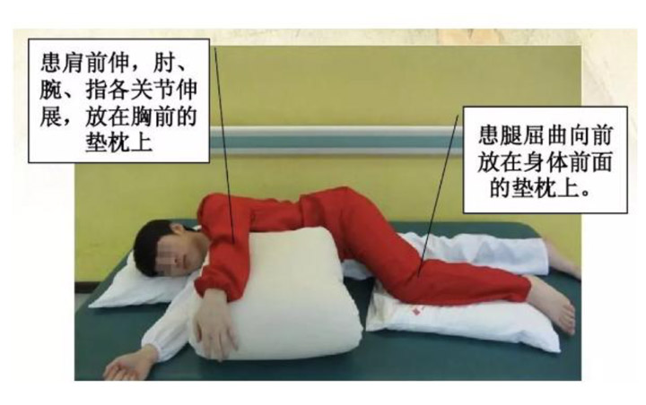 ?患侧侧卧位:头下垫枕,躯干稍后仰,其后方可垫枕支撑。患侧肩胛带充分前伸,肩关节前屈90°~130°。患侧肘关节自然伸展,前臂旋后,手呈背屈位。患侧髋关节自然伸展,膝关节可稍屈曲。健侧上肢自然放置,健侧下肢呈踏步状置于枕上。