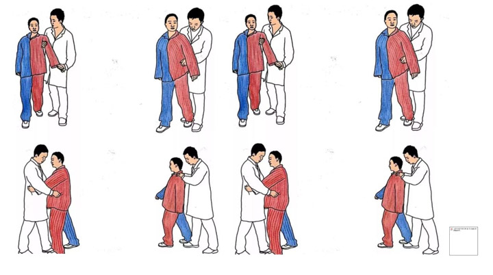 待患者站立后,嘱患者上肢自然垂直于体侧,在逐渐去除对躯干的支撑时保持站立位。待患者能独立保持静态站立后,嘱患者将自身中心逐渐移向患侧,以训练患腿的持重能力。继而通过患者自身移动重心等动作进行自动态站位平衡的训练。直至患者能在突然受到外力推拉时仍能保持平衡,即达到被动态站位平衡。